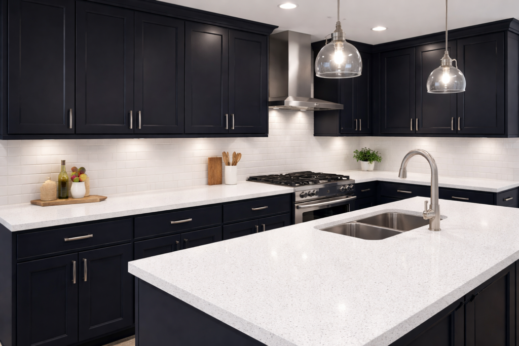 Dark cabinetry can create a striking contrast with Polar Frost quartz when lighting is thoughtfully planned. Natural light, layered fixtures, and under-cabinet lighting help keep the quartz from appearing too cool or severe.